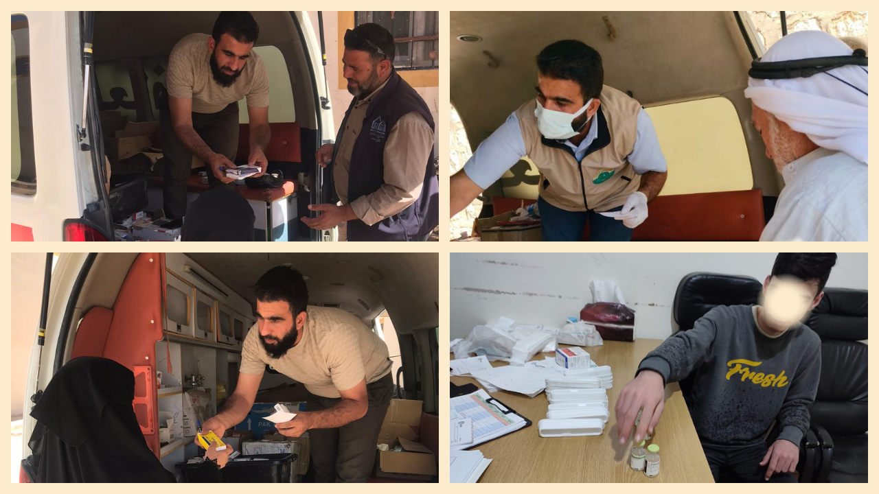 نقوم بالخروج إلى القرى والمدن الفقيرة بحثاً عن المرضى لنقوم بمداواتهم من خلال فريقنا الطبي المتخصص في مجالات طبية شتى حيث أننا في كل فترة نقوم بالتجول بين المخيمات والقرى النائية في مختلف محافظات الجمهورية العربية السورية لمعاينة ومعالجة المرضى